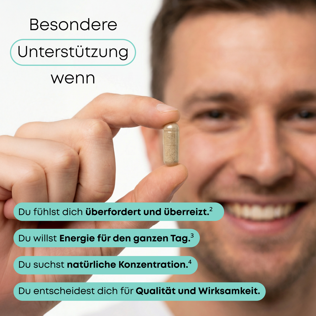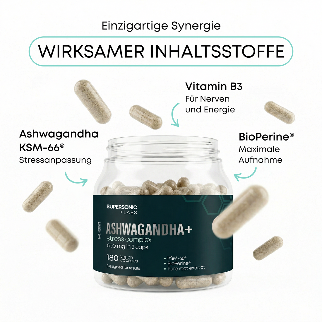 Denn wir wollten keine weitere gewöhnliche Ergänzung schaffen, sondern ein komplettes Support-System. Vitamin B3 ist der perfekte Partner für Ashwagandha – es pflegt Ihr Nervensystem und hilft, Müdigkeit zu reduzieren. BioPerine® wiederum ist unser Wirksamkeitsgarant – es sorgt dafür, dass die wertvollen Inhaltsstoffe maximal von Ihrem Körper aufgenommen werden.