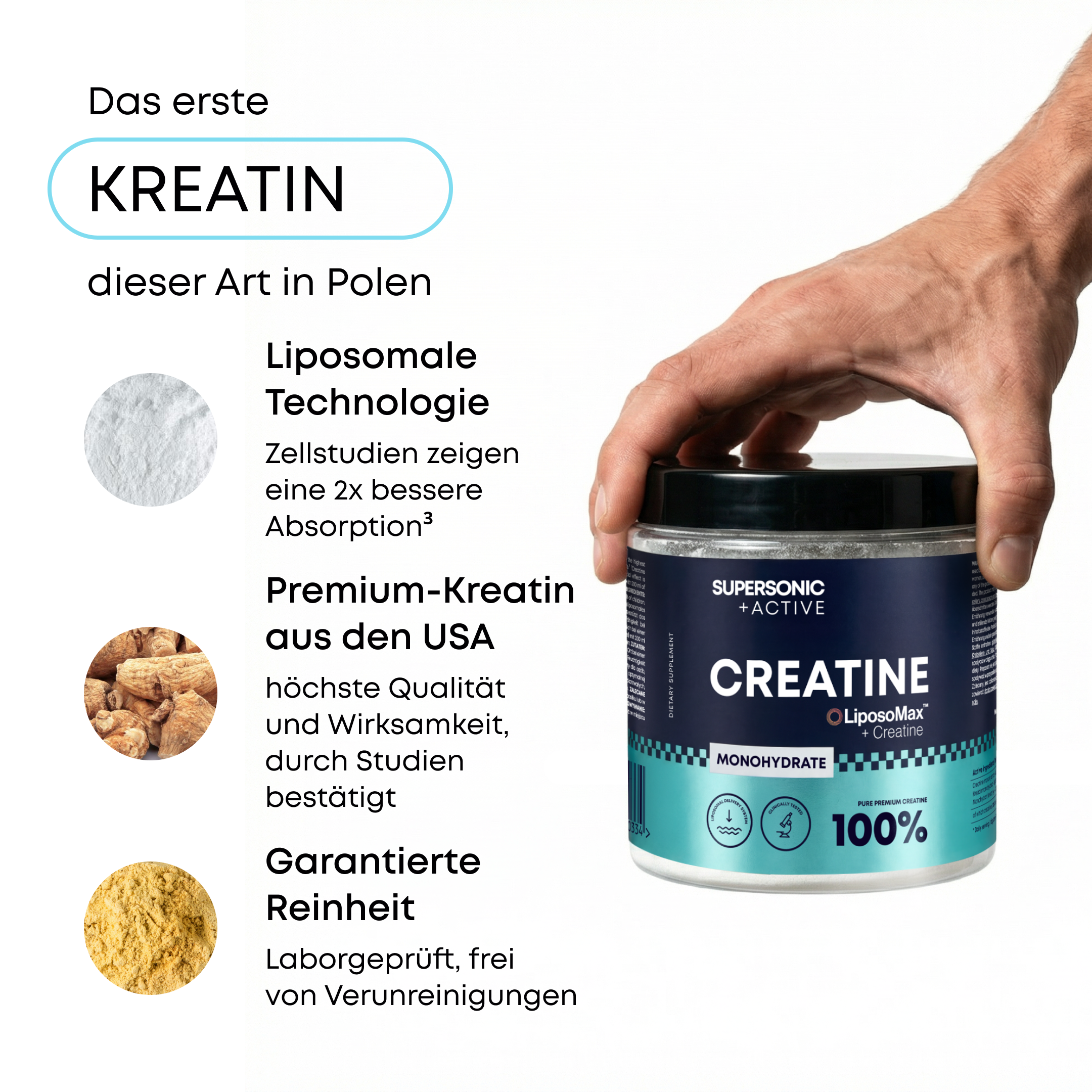 „Der Markt für Kreatinpräparate ist voller unerfüllter Versprechen. Die Kraft von SUPERSONIC +ACTIVE Liposomal Creatine liegt in Wissenschaft und Technologie. Die liposomale Formel von LiposoMax® ist ein Durchbruch, der einen echten Vorteil gegenüber herkömmlichen Monohydraten bietet. Für Menschen, die das Training ernst nehmen und echte Effekte sehen wollen.“