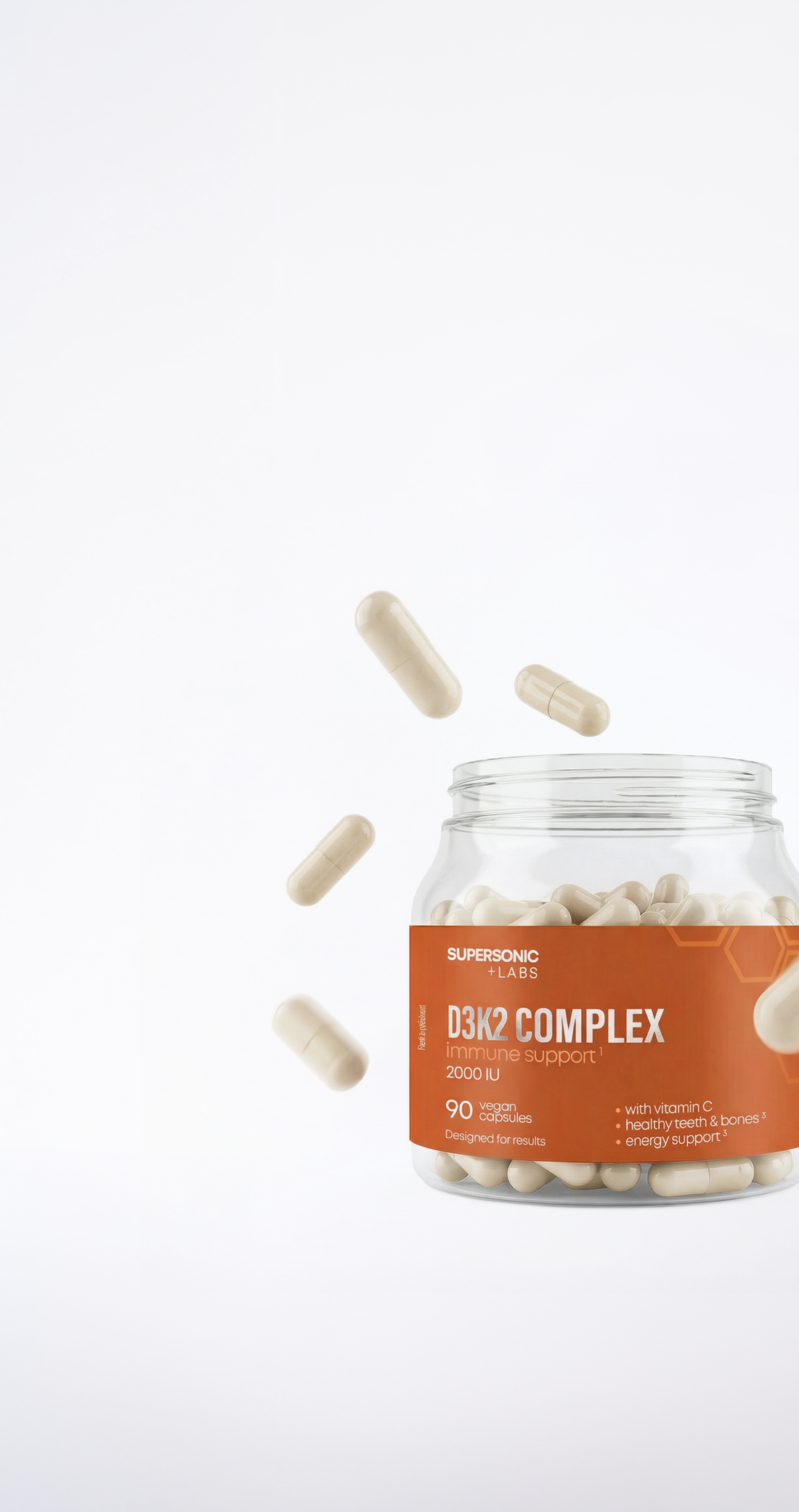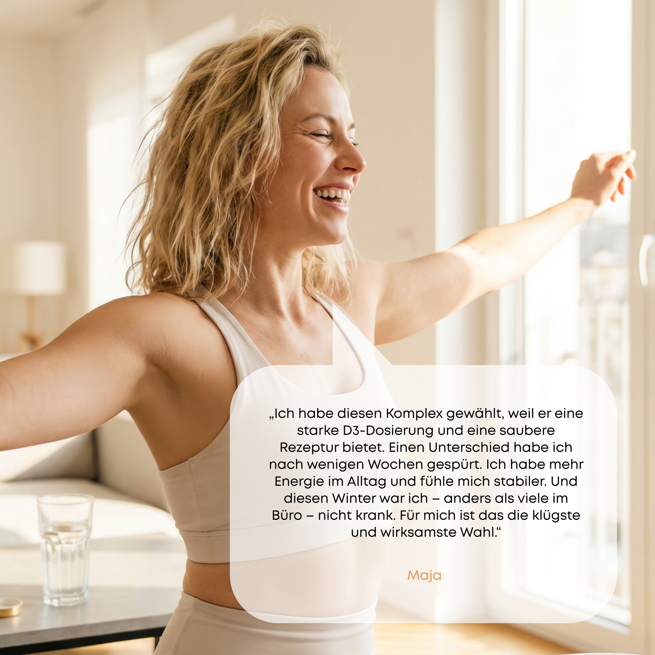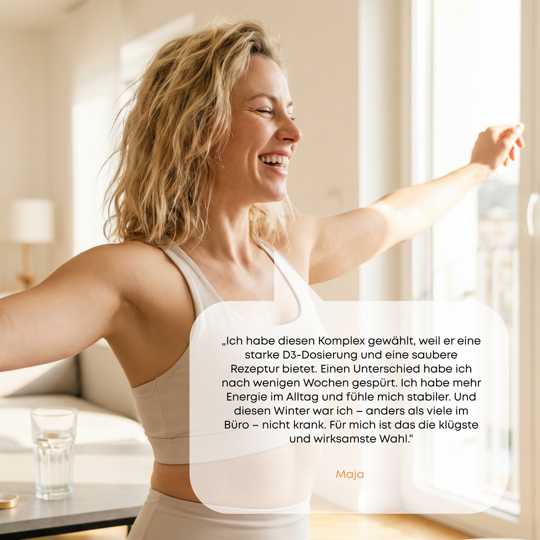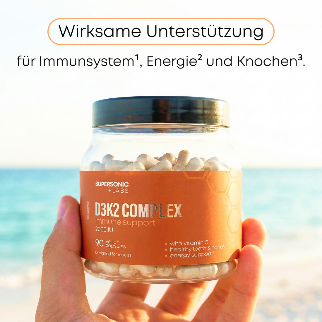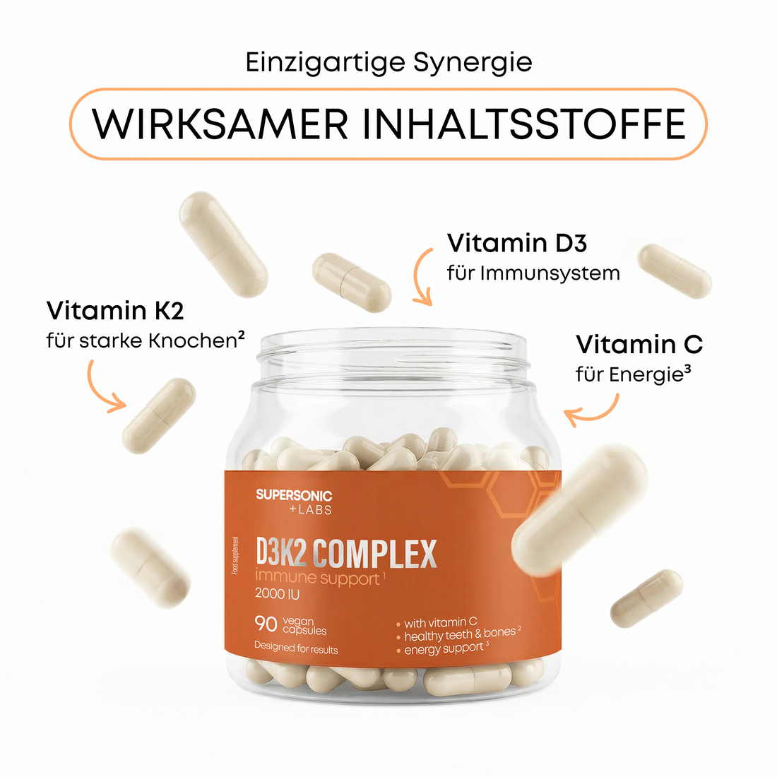- Unterstützung auf 3 Ebenen: Immunität, Knochen, Energie (Vitamin D3, K2, C)