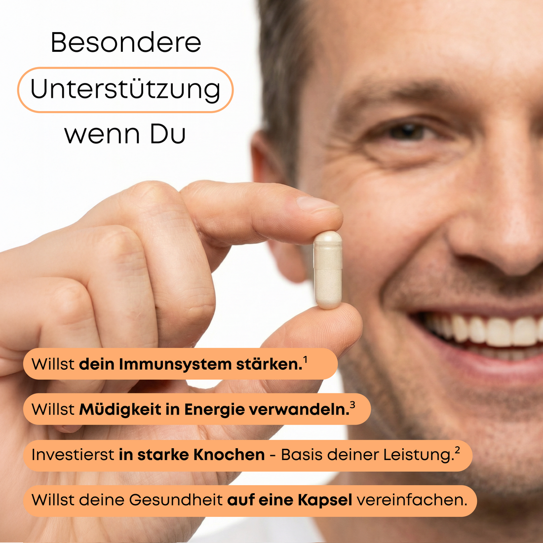 Vergessen Sie das Nahrungsergänzungsmittel-Chaos. Eine Kapsel pro Tag reicht aus, um eine umfassende Unterstützung zu gewährleisten.