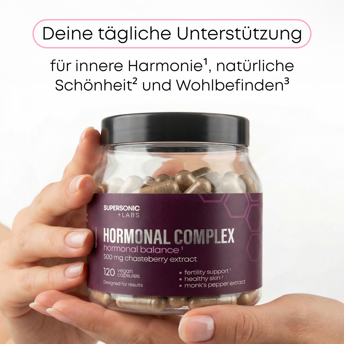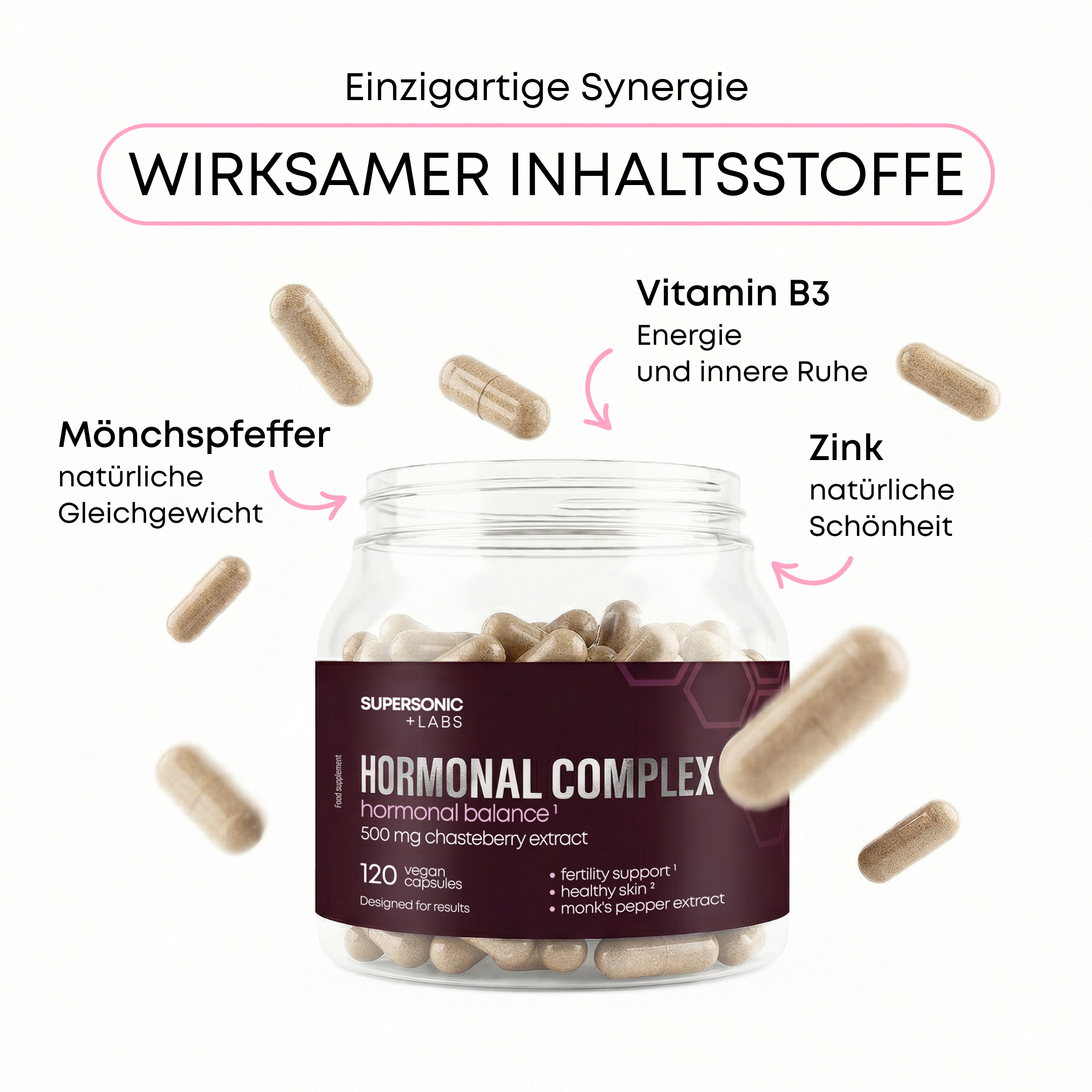Hormonal Complex ist viel mehr als das. Es handelt sich um eine vollständige, gut durchdachte Formel. Zusätzlich zu einer hohen Dosis Mönchspfeffer, der Ihr Gleichgewicht unterstützt, haben wir Zink hinzugefügt, um Ihre Schönheit von innen zu pflegen, und Vitamin B3, das für Ihre Ruhe und Energie sorgt. Wir haben alles mit BioPerine® verstärkt, um sicherzustellen, dass Ihr Körper von jedem Inhaltsstoff voll profitieren kann.
