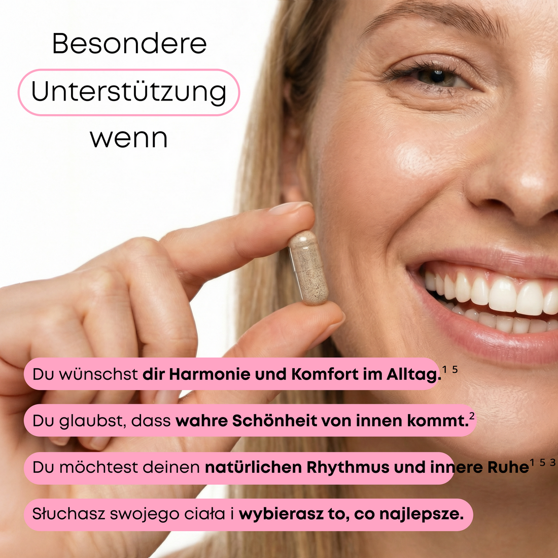 Dies ist eine Formel für Frauen, die ihren Körper auf natürliche Weise unterstützen möchten. Es ist perfekt, wenn Sie während Ihres Zyklus wieder Komfort und Ausgeglichenheit finden, auf das strahlende Aussehen Ihrer Haut, Haare und Nägel achten und sich bewusst um die Gesundheit Ihrer Frauen kümmern möchten.