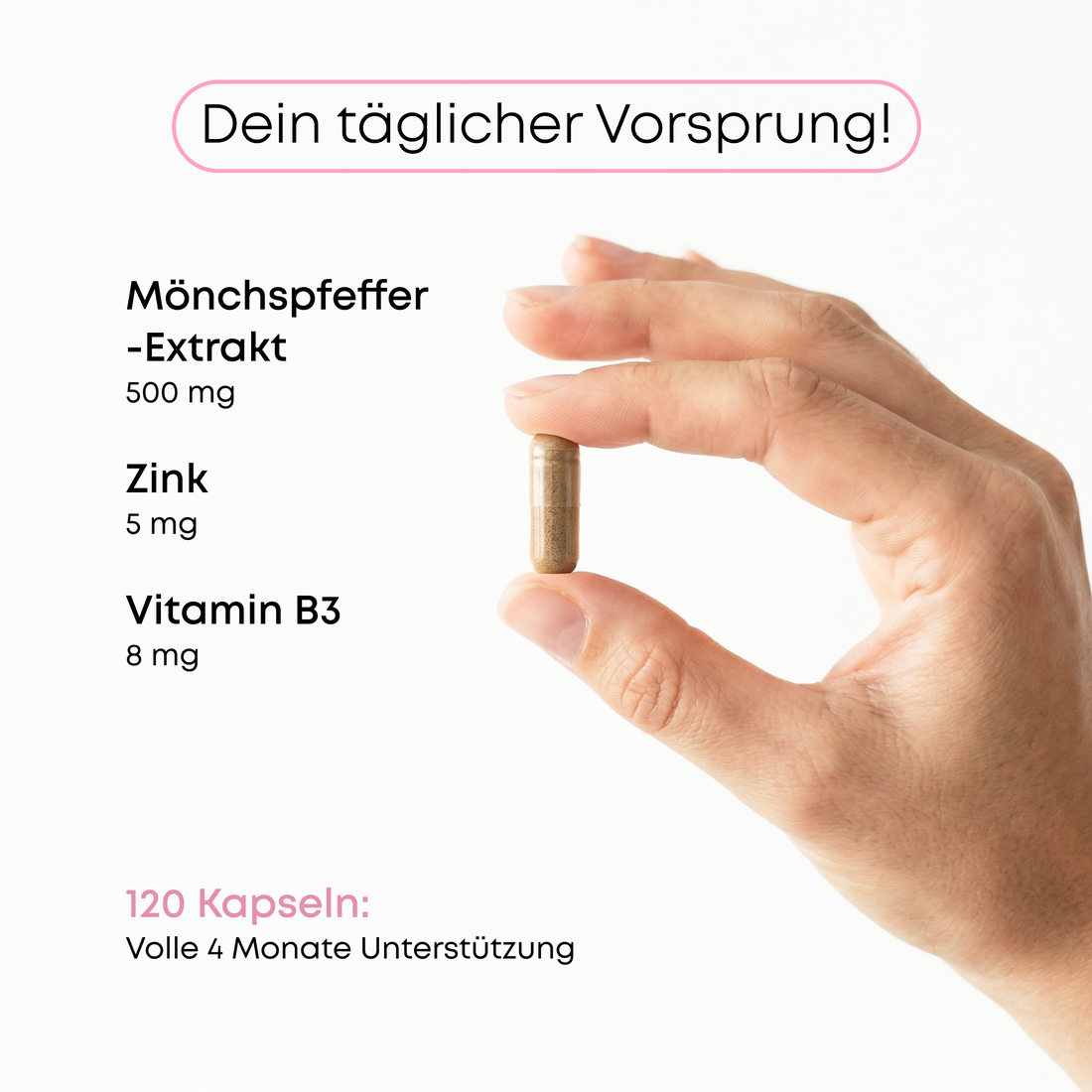 Spüren Sie Harmonie und Wohlbefinden während des gesamten Zyklus. Dank Chasteberry-Extrakt, der den weiblichen Körper unterstützt.