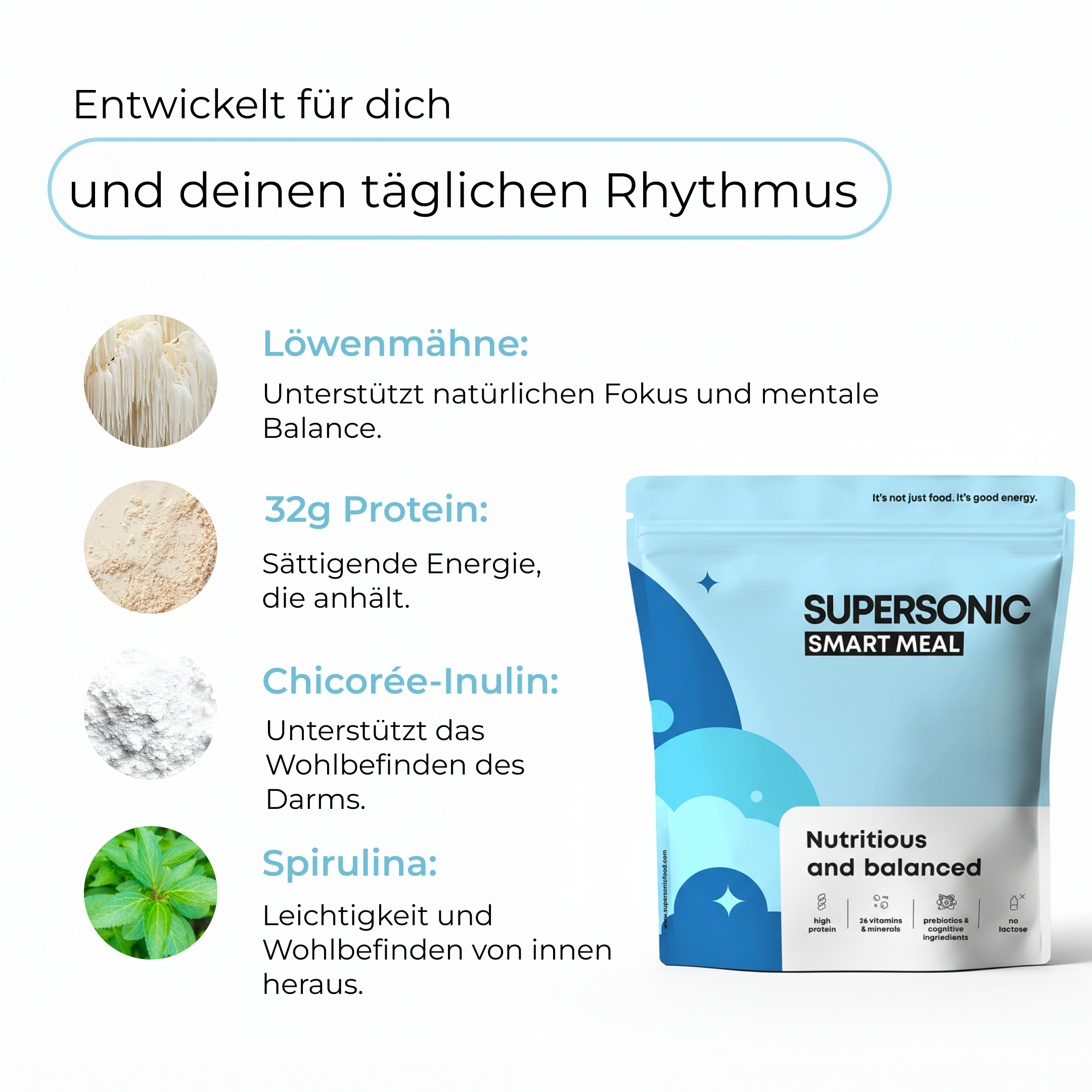 Dank Inhaltsstoffen mit niedrigem glykämischen Index hilft Ihnen Smart Meal dabei, plötzliche Energieverluste und „Gehirnnebel“ zu vermeiden, sodass Sie von morgens bis abends geistig klar bleiben. Untersuchungen zeigen, dass Mahlzeiten mit niedrigem GI ein stabiles Energieniveau fördern.