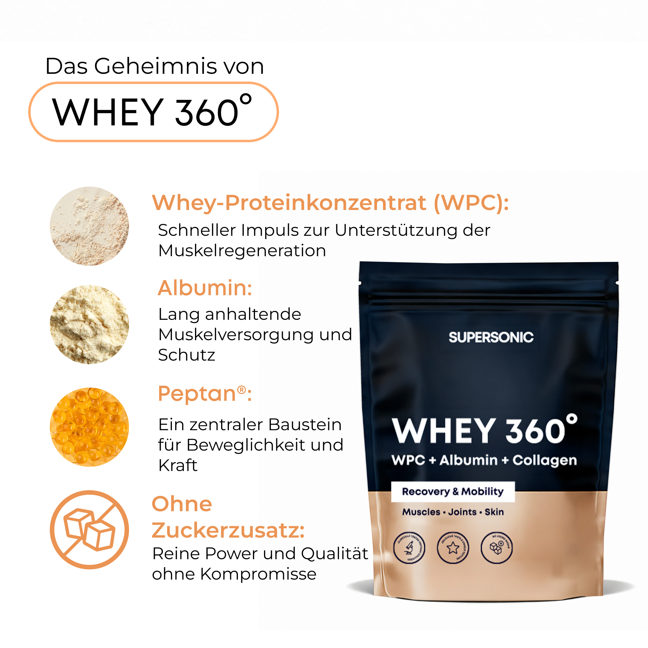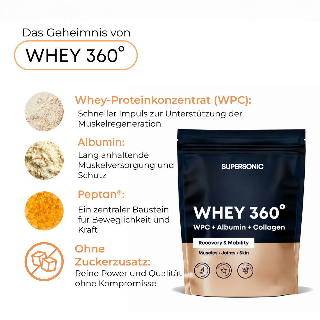 Deshalb schätze ich Whey 360° so sehr. Dies ist kein gewöhnlicher Proteinshake – er kombiniert eine hochwertige Proteinmischung mit Peptan®-Kollagen, das den gesamten Bewegungsapparat unterstützt und die Regeneration beschleunigt.