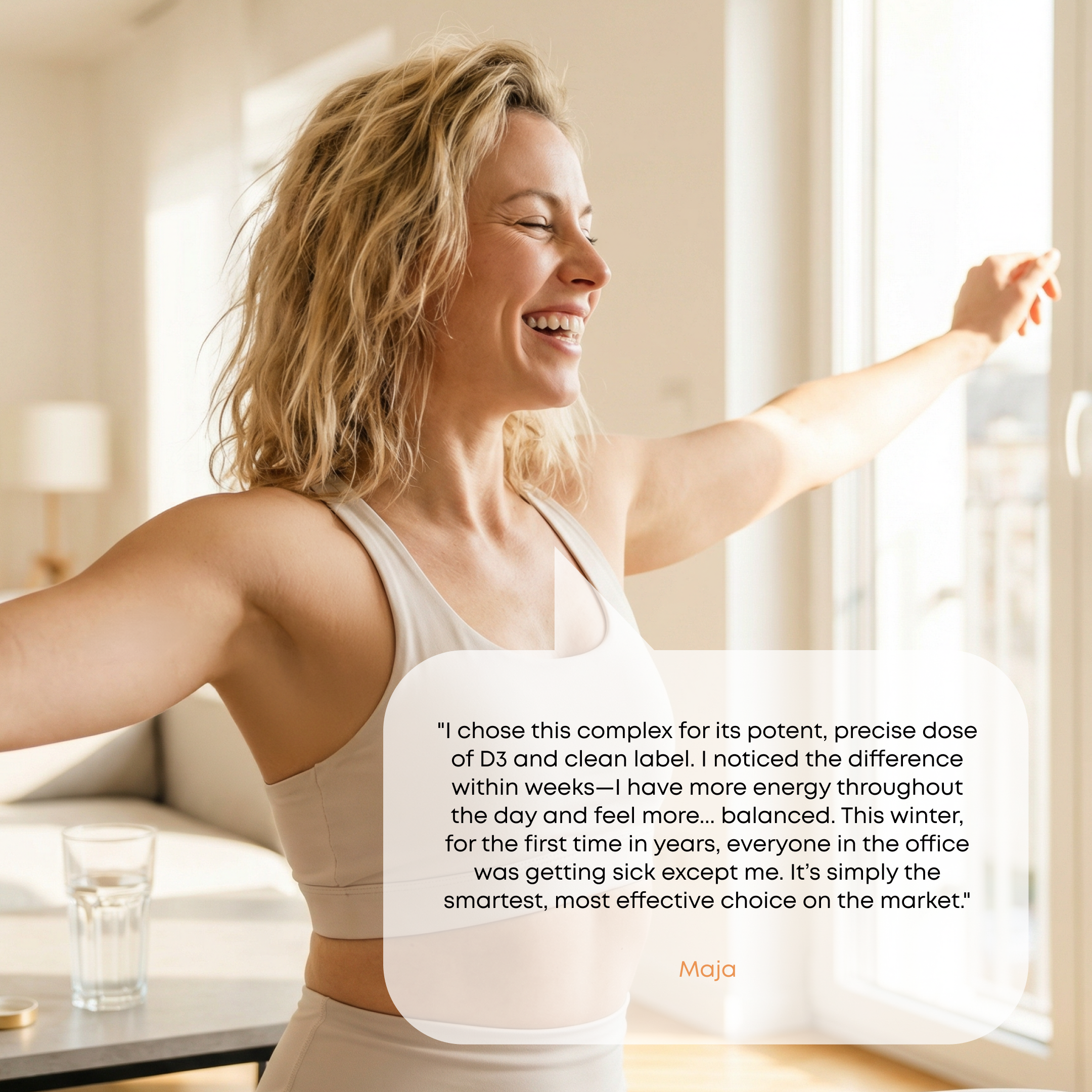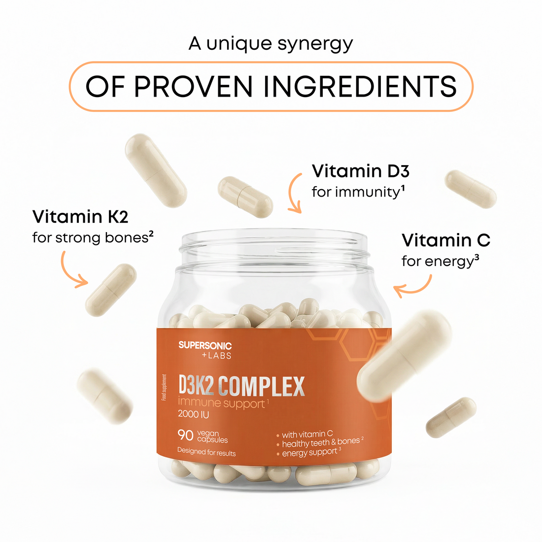 - Support on 3 levels: immunity, bones, energy (vitamin D3, K2, C)