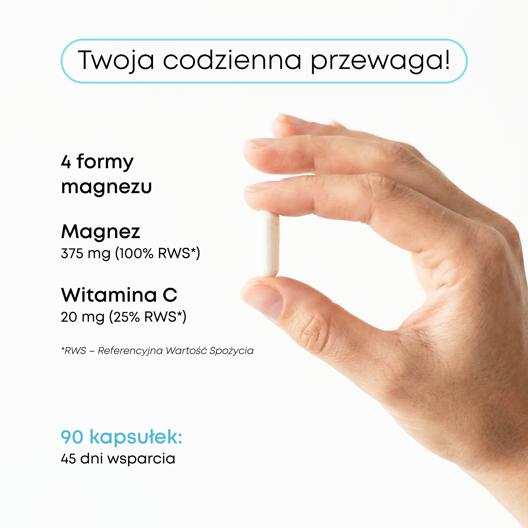 Wyobraź sobie, że każda forma magnezu wchłania się w Twoim organizmie nieco inną drogą. Używając tylko jednej, ryzykujesz, że nie zostanie ona w pełni przyswojona. Łącząc cztery różne formy, w tym te najdelikatniejsze dla żołądka jak glicynian, tworzymy formułę, która działa wszechstronniej i gwarantuje maksymalne wchłanianie. To po prostu mądrzejszy i skuteczniejszy sposób na uzupełnienie magnezu.