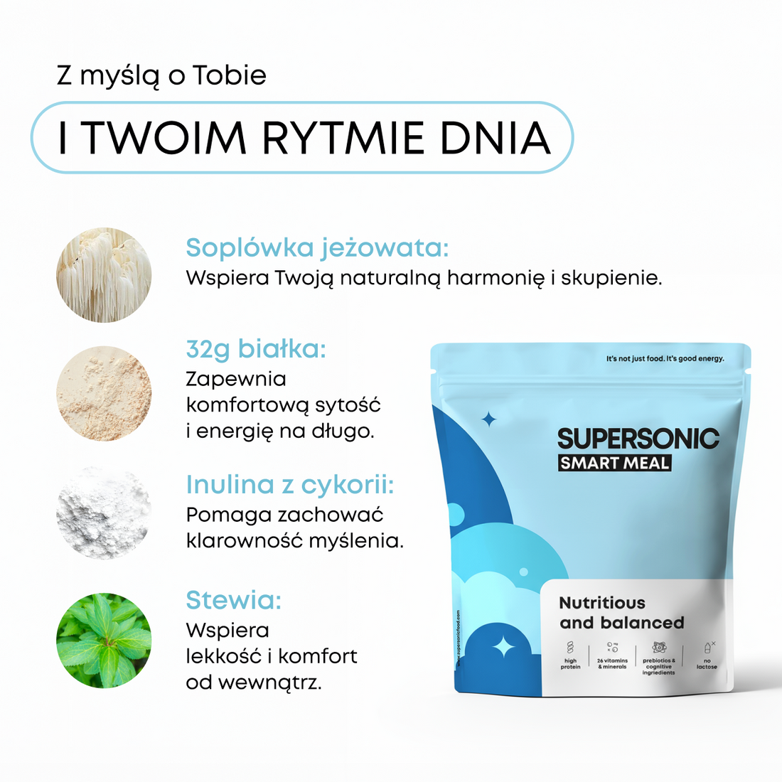 Dzięki składnikom o niskim indeksie glikemicznym, Smart Meal pomaga unikać nagłych spadków energii i "mgły mózgowej", pozwalając Ci zachować klarowność umysłu od rana do wieczora. Badania wskazują, że posiłki o niskim IG sprzyjają stabilnemu poziomowi energii.