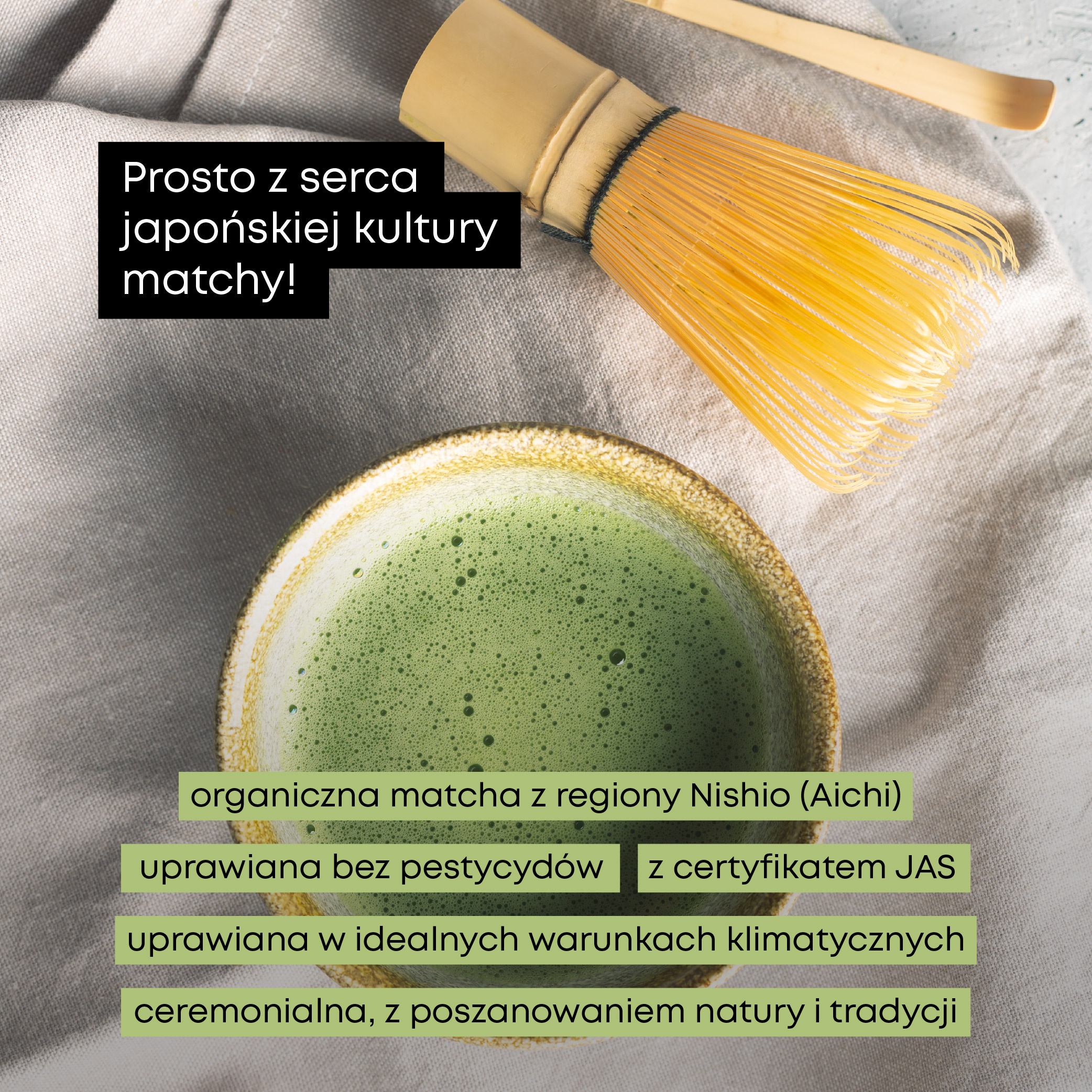 Zalej 1,5-2g matchy (około 1 płaskiej łyżeczki) 150-200 ml wody w temperaturze 75-85°C. Wymieszaj używając elektrycznego spieniacza do mleka lub ręcznego miksera. Dla łagodniejszego smaku możesz dodać lub zamienić wodę na ciepłe mleko roślinne (np. kokosowe, migdałowe) i opcjonalnie dosłodzić napój miodem lub syropem klonowym.